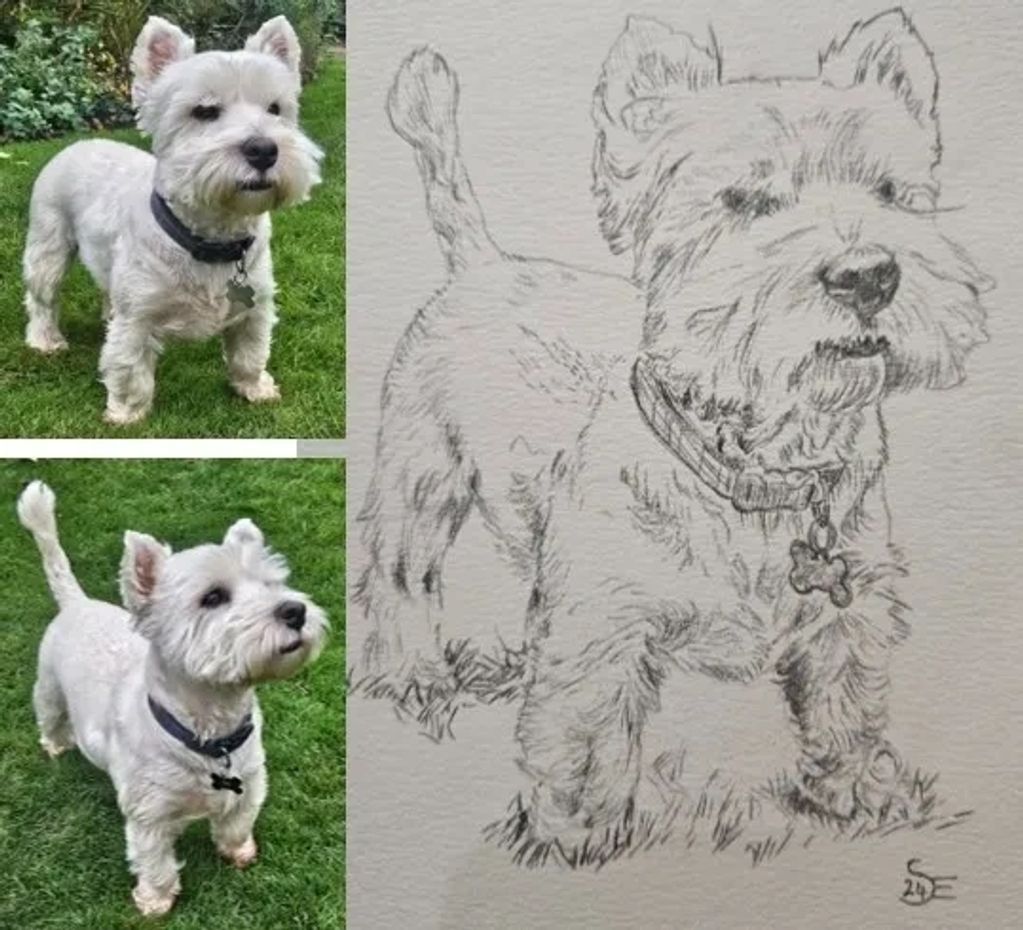 A greyscale pencil portrait of Rabbie using two photos so as I could include his tail in the finished portrait.